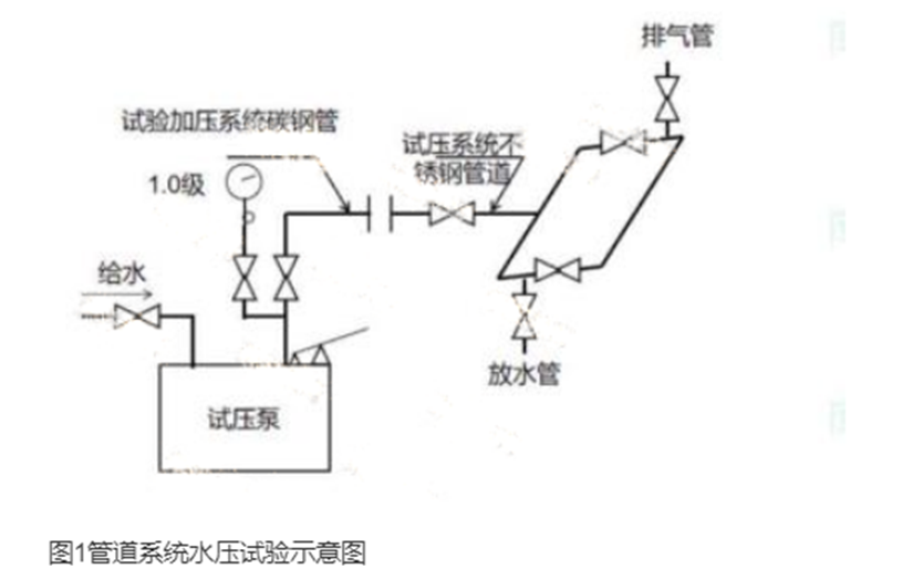 330.(2020年真题)某安装公司承包大型制药厂的机电安装工程,工程内容:设备、管道和通风空调等工程安装。安装公司对施工组织设计的前期实施,进行了监督检查:施工方案齐全,临时设施通过验收,施工人员按计划进场,技术交底满足施工要求,但材料采购因资金问题影响了施工进度。不锈钢管道系统安装后,施工人员用洁净水(氯离子含量小于25ppm)对管道系统进行试压时(见图1),监理工程师认为压力试验条件不符合规范规定,要求整改。由于现场条件限制,有部分工艺管道系统无法进行水压试验,经设计和建设单位同意,允许安装公司对管道环向对接焊缝和组成件连接焊缝采用100%无损检测,代替现场水压试验,检测后设计单位对工艺管道系统进行了分析,符合质量要求。检查金属风管制作质量时,监理工程师对少量风管的板材拼接有十字形接缝提出整改要求。安装公司进行了返修和加固,风管加固后外形尺寸改变但仍能满足安全使用要求,验收合格。