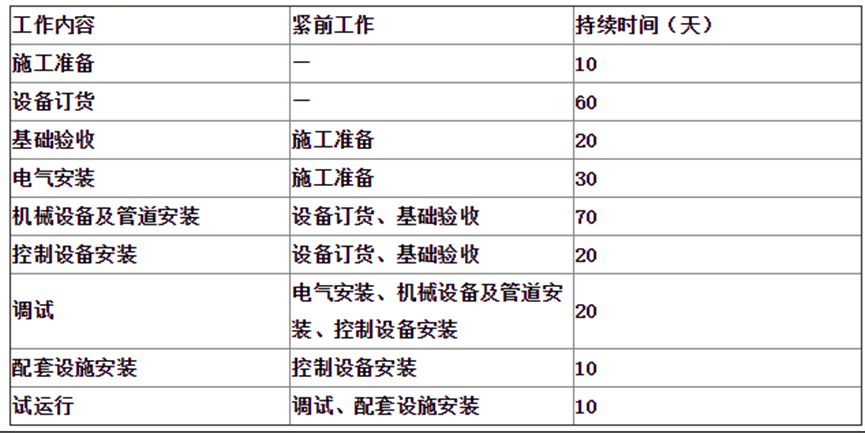 310.(2016年真题)某制氧站经过招投标,由具有安装资质的公司承担全部机电安装工程和主要机械设备的采购。安装公司进场后,按合同工期,工作内容,设备交货时间,逻辑关系及工作持续时间(见表1)编制了施工进度计划。表1制氧站安装公司工作内容、逻辑关系及持续时间表
