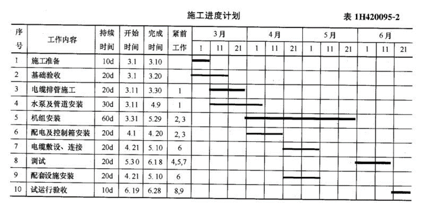 186.A安装公司承包某分布式能源中心的机电安装工程,工程内容有:三联供(供电、供冷、供热)机组、配电柜、水泵等设备安装和冷热水管道、电缆排管及电缆施工。三联供机组、配电柜、水泵等设备由业主采购;金属管道、电力电缆及各种材料由安装公司采购。A安装公司项目部进场后,编制了施工进度计划(见表1H420095-2)、预算费用计划和质量预控方案。对业主采购的三联供机组、水泵等设备检查、核对技术参数,符合设计要求。设备基础验收合格后,采用卷扬机及滚杠滑移系统将三联供机组二次搬运、吊装就位。安装中设置了质量控制点,做好施工记录,保证安装质量,达到设计及安装说明书要求。在施工中发生了以下3个事件:事件1:项目部将2000m电缆排管施工分包给B公司,预算单价为120元/m,在3月22日结束时检查,B公司只完成电缆排管施工1000m,但支付给B公司的工程进度款累计已达160000元,项目部对B公司提出警告,要求加快施工进度。事件2:在热水管道施工中,按施工图设计位置施工,碰到其他管线,使热水管道施工受阻,项目部向设计单位提出设计变更,要求改变热水管道的走向,结果使水泵及管道安装工作拖延到4月29日才完成。事件3:在分布式能源中心项目试运行验收中,有一台三联供机组运行噪音较大,经有关部门检验分析及项目部提供的施工文件证明,不属于安装质量问题,后增加机房的隔音措施后验收通过。