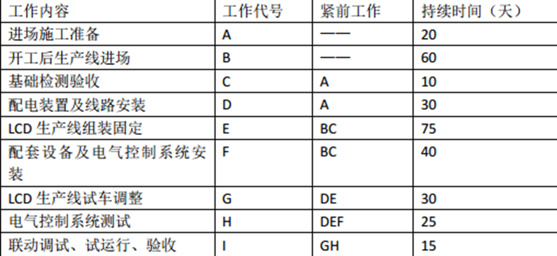 150.南方电子电气有限公司(建设单位)新建液晶屏(LCD)生产车间,其生产线由建设单位从国外订购,A施工单位承包安装。A施工单位进场时,生产车间的土建工程和机电配套工程(B施工单位承建)已基本完工。A施工单位按合同工期要求,与建设单位、生产线供应商和B施工单位洽谈,编制了LCD生产线安装网络计划工作的逻辑关系及工作持续时间表。LCD生产线安装网络计划工作逻辑关系及持续时间表