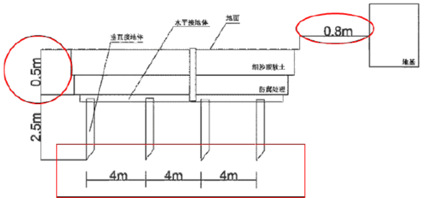 180.为了适应经济开发区规模不断扩大的需要,某市政府计划在该区内新建一座110kV的变电站。新建变电站周边居住人口密集,站址内有地下给水管道和一幢六层废弃民宅。为加强现场文明施工管理,建设单位要求进行绿色施工评价,项目部制定了相应的现场环境保护措施。主要措施如下:措施1:为减少六层废弃民宅拆除时产生扬尘,在拆除时计划配合洒水等。措施2:为及时清除施工中产生的固体和液体废物,计划将有毒有害废弃物、废油等现场全部烧掉。措施3:计划租赁的推土机和挖掘机只能夜间使用,为了防止噪声扰民,施工单位计划将噪声限值在65dB(分贝)。由于施工单位施工资源有限,将防雷接地工程和供电干线的施工分包给具有专业资质的A单位。A单位编制了防雷接地装置的专项施工方案,接地体采用圆钢和扁钢搭接焊接。监理工程师在审核过程中发现接地系统施工图(如下图)存在几处错误,要求A单位进行修改后重新报批,最终施工方案审批通过,施工方案经过逐级交底后施工