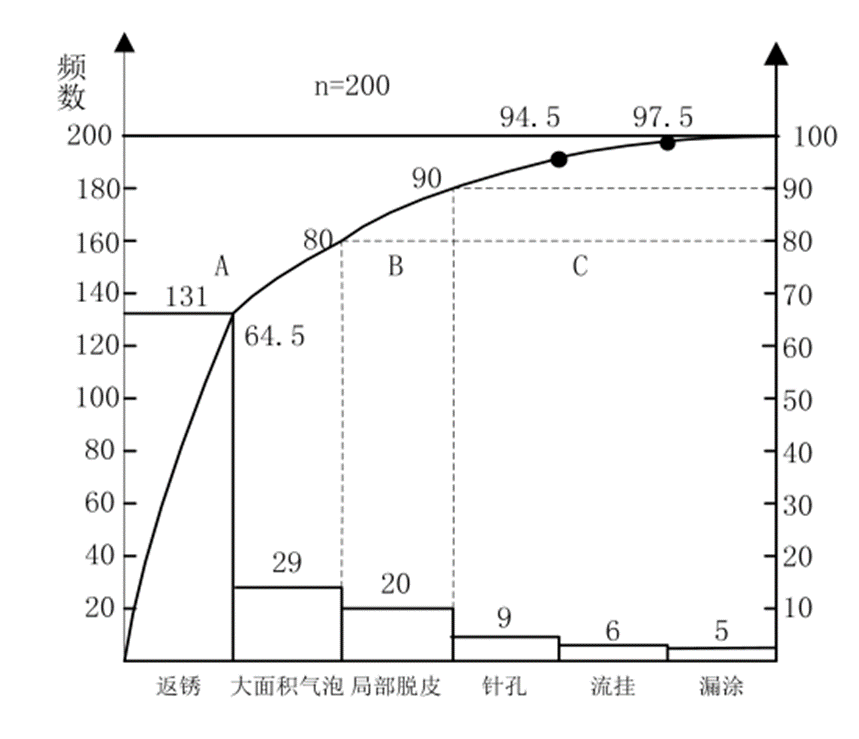 项目部启动质量问题处理程序,针对产生的质量问题,分析了原因,明确了整改方法,整改措施完善后得以妥善处理,并按原验收规范进行验收。【问题】2.根据质量员的统计表,按排列图法,将底漆质量分别归纳为A类因素,B类因素和C类因素?3.项目部就底漆质量缺陷应分别做何种后续处理?制定的质量问题整改措施还应包括哪些内容?