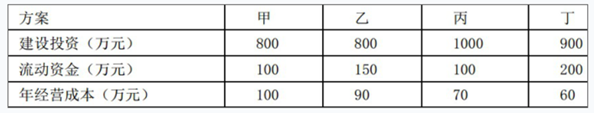 2550.某项目有甲、乙、丙、丁4个可行方案,建设投资、流动资金和年经营成本见下表。若基准收益率为10%,采用折算费用法比选,最优方案为()方案。