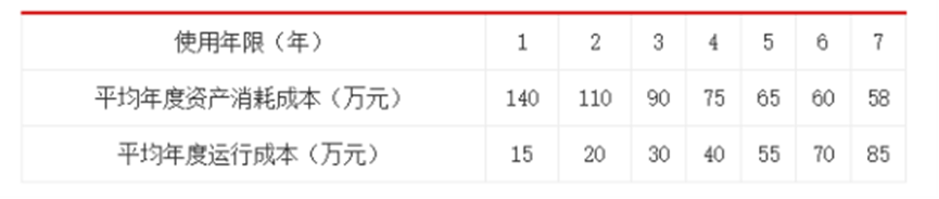 1285.某设备在不使用年限(1至7年)时的平均年度资产消耗成本和平均年度运行成本如下表所示。则该设备在静态模式下的经济寿命为()年。(2013)