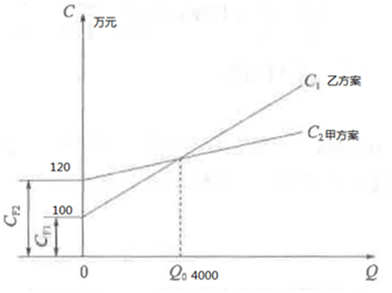 423.(2019年真题)某施工项目有甲乙两个对比工艺方案,均不需要增加投资。采用甲方案需年固定费用120万元,单位产量可变费用为450元;采用乙方案需年固定费用100万元,单位产量可变费用为500元。下列关于该对比方案决策的说法,正确的有()