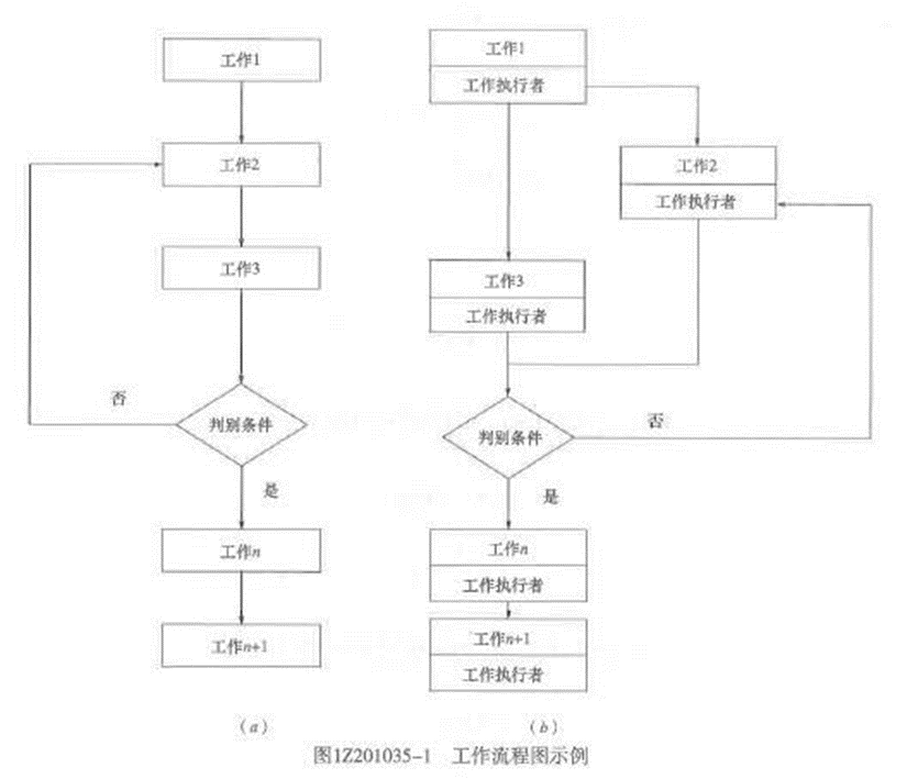 解析:2020/2019教材P28本题考察的是工作流程图。工作流程图用图的形式反映一个组织系统中各项工作之间的逻辑关系,它可用以描述工作流程组织。工作流程图是一个重要的组织工具,如图1Z201035-1所示。工作流程图用矩形框表示工作,如图1Z201035-1(α)所示,箭线表示工作之间的逻辑关系,菱形框表示判别条件。也可用图12201035-1(b)的方式表示工作和工作的执行者。