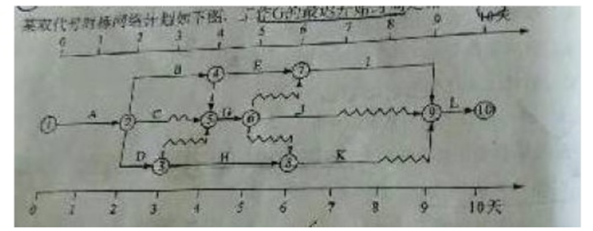 1782.某双代号时标网络计划如下图,工作G的最迟开始时间是第()天。