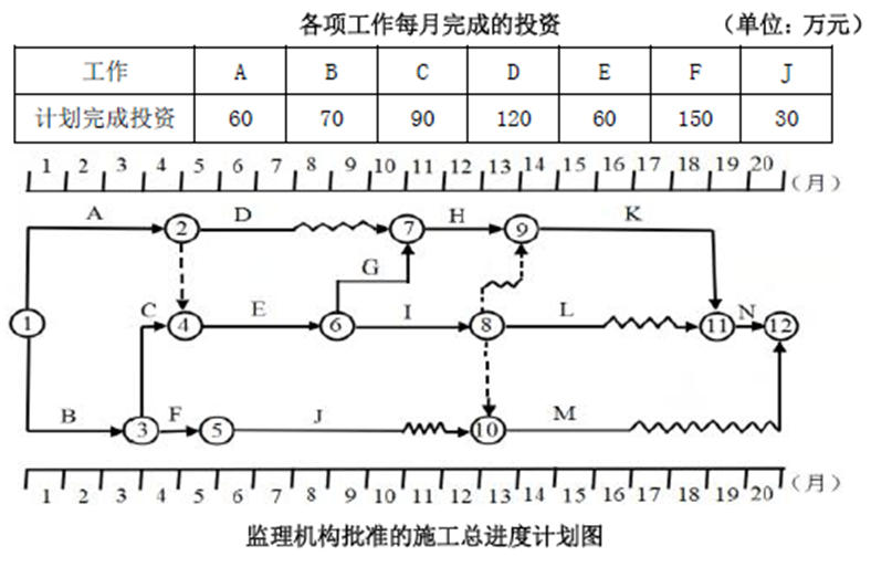 133.某工程,建设单位与施工单位按照《建设工程施工合同(示范文本)》(GF-2013-0201)签订了施工合同,采用可调价合同形式。工期20个月,项目监理机构批准的施工总进度计划如下图所示,各项工作在其持续时间内均按匀速进展,每月计划完成的投资部分见下表。