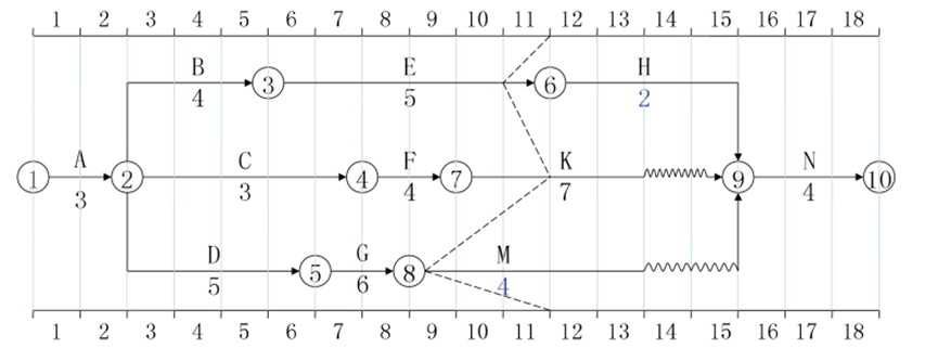 45.某工程施工前,承包人编制了如下双代号网络图(单位:天),经监理批准后实施。