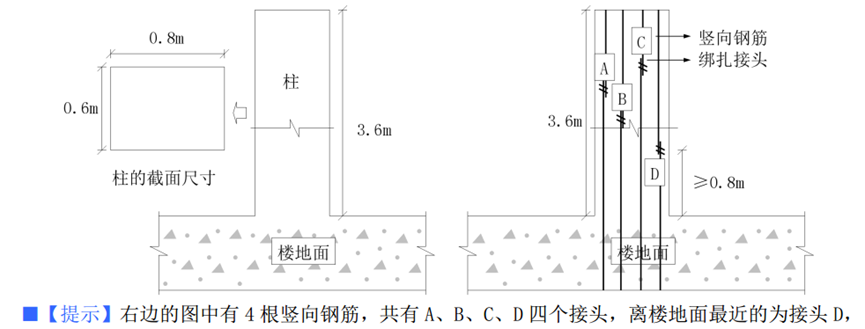 右边的图中有4根竖向钢筋,共有A、B、C、D四个接头,离楼地面最近的为接头D,且其离地面高度至少=max{500mm,3.6×1/6,0.8m}=0.8m。(3)框架梁、牛腿及柱帽等钢筋,应放在柱子纵向钢筋内侧。(4)柱中竖向钢筋搭接时,角部钢筋的弯钩应与模板成45°;中间钢筋的弯钩应与模板成90°。相关知识点:
