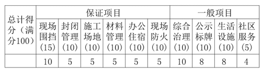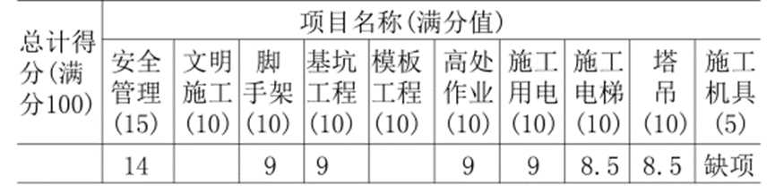 汇总表中已知部分分值。其他得分情况为:(1)该项目有2种模板,大模、滑模分别得84、88分。(2)《文明施工检查评分表》得分情况如下。