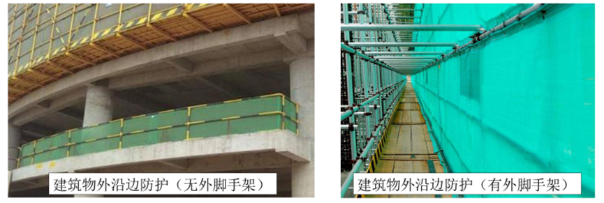(4)在坡度大于25°的屋面上作业,当无脚手架时的防护:在屋檐边设置不低于1.5m高的防护栏杆,并应采用密目式安全立网封闭。(5)施工升降机、物料提升机等与建筑物间设置的停靠平台的防护:1)两侧边:应设置防护栏杆、挡脚板、密目式安全立网或工具式栏板封闭。2)平台口应设置高度不低于1.8m的防护门,并应设置防外开装置@##