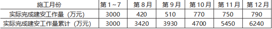 45.某工程项目合同总价为6240万元,工期12个月,竣工日期2002年10月30日,承包合同另外规定:(1)工程预付款为合同总价的25%;(2)工程预付款从未施工工程所需的主要材料及构配件价值相当于工程预付款时起扣,每月以抵充工程款的方式陆续收回。主要材料及构配件比重按60%考虑;(3)除设计变更和其他不可抗力因素外,合同总价不做调整;(4)材料和设备均由B承包商负责采购;(5)每月签发的付款最低金额是400万;(6)工程保修金为合同总价的5%,在工程结算时一次扣留,工程保修期为正常使用条件下,建筑工程法定的最低保修期限。经业主工程师代表签认的B承包商实际完成的建安工作量价款(第1月~第12月)见下表。