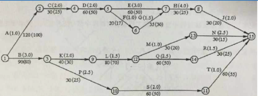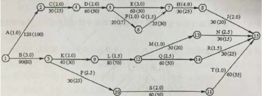 4.业主要求提前30天完成井底车场的施工,如何调整才能使增加的费用最低?最低费用是多少?答:井底车场正常施工5个月后,这时工序A、B、C、K、P已经完成,工序D尚未开始,工序L已经施工20天,工序S已经施工30天,这时可将剩余没有完成的工序根据费用优化的原理进行调整,压缩关键线路的工序时间30天,并且所需增加的费用最少。其结果是:D压缩10天,费用增加20万元;J压缩10天,费用增加20万元;E压缩8天,同时F压缩3天,费用增加24+3=27万元;H压缩2天,费用增加8万元。其他工序不用调整,这时可保证井底车场提前30天完成,但最低需要增加费用75万元。相关知识点: