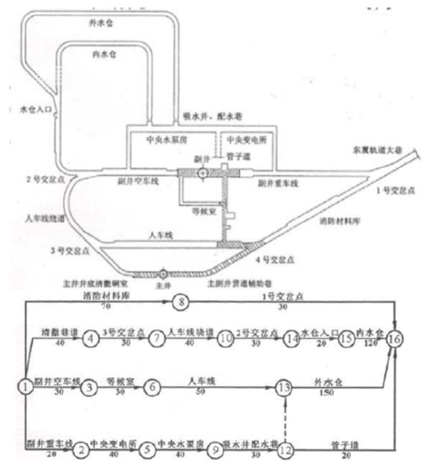 正确答案:答案:1.计算网络图中工作6→13和5→9的总时差和自由时差。答:⑥→13的总时差和自由时差分别是20天、20天;⑤→⑨的总时差和自由时差分别是0天、0天。2.指出该网络图的关键线路和总工期。答:关键线路是:①→②→⑤→⑨→12→13→16;①→④→⑦→10→14→15→16。总工期为280天。3.指出网络图中的哪些工作安排不合理?分别说明原因。答:1)主井改绞后首先安排副井空车线施工不妥,原因是副井进入永久装备工作,副井空车线不具备施工条件(没有通路或副井空车线掘进工作面无法排矸。)2)外水仓工程的紧前工作安排吸水机和配水巷工程不妥,因为外水仓工程必须从水仓入口处开工,而从吸水井和配水巷无法开工施工外水仓。3)人车线施工安排不合理。从提升运输能力考虑,由于人车线是主井环形车场绕道的重要组成部分,应尽早安排施工,便于形成主井的环形车场,所以主井改绞后应首先安排人车线施工。