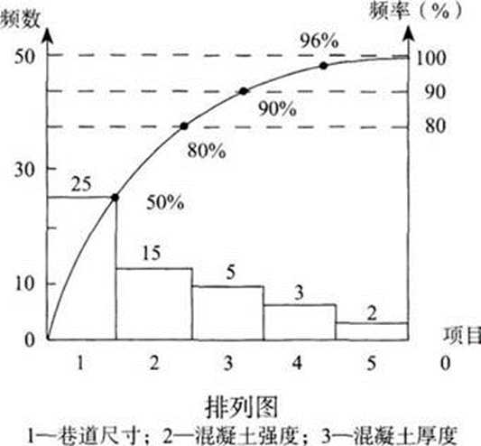 97.施工某矿井下轨道运输大巷。断面形式为半圆拱,采用锚喷网联合支护方式,钢筋锚杆直径22mm,树脂药卷锚固;锚杆间排距800mm×800mm,喷射混凝土强度等级C20,该巷道长500m,在施工完100m巷道时,建设单位在组织质量检查过程中出现有喷射混凝土强度不合格15次,喷层厚度不合格5次;锚杆抗拔力不合格3次,锚杆间排距不合格2次;断面尺寸不合格25次。问题1.根据案例背景,绘制影响该工程质量因素的排列图。2.根据排列图,判断影响该工程质量的主次因素。