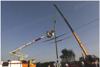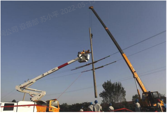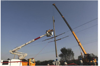 779、某带电班在10kV飞行线组立电杆,该班组所制定的立杆方法是使用吊车吊起电杆,从导线上方向下立杆。根据如图所示,分析此作业存在的错误。如图所示,()未进行必要绝缘遮蔽。