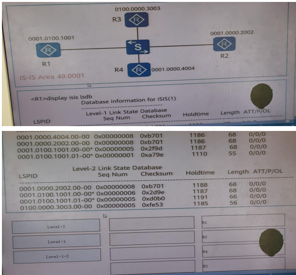 137.某网络所有路由器运行 IS-IS, 且均在 Area 49.0001, 其中 R1 的 LSDB 如图所示, 据此判断四台路由器的 Leve1 等级。(原题中没有图,替换原图)
