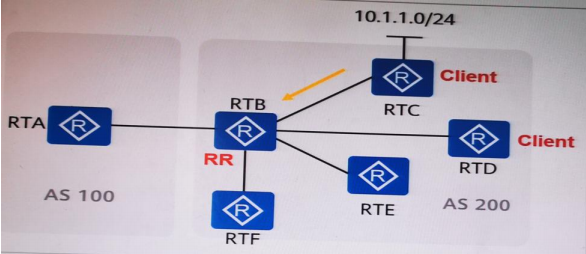 185、如下图所示, RTC 上将 10.1.1.0/24 宣告进 BGP, RTC 为路由反射器 RTB 的客户端, 则路由器 RT 不会收到由 RTB 反射的路由条目 10.1.1.0/24。(使用字母大写)