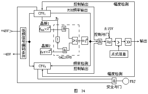 两套微处理器CPU受同一低频编码条件控制,其中由CPU1产生低频控制信号FC。晶振1、2是高精否度、高稳定度的信号源,产生上、下边频相对应的信号源(f0上×211、f0下×211)。经过移频产生环节,在FC控制下,它们交替输出,经过211分频产生移频信号。移频信号分别送到两CPU进行频率检测,检测结果符合规定后,经控制与门把移频信号送至低通滤波环节,实现方波-正弦波的变换。功放输出的移频信号再送至两个CPU进行幅度检测。两个CPU对移频信号的低频、载频和幅度特征进行检测,符合要求后打开安全门,使发送报警继电器FBJ励磁,并使经过功放的移频信号输出。