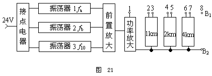 振荡器为LC振荡器,由接点电路控制,同时只能发出一种频率。振荡信息进入双运放组成的前置放大器,分别对正、负信息进行放大。然后经变压器输入到达林顿管组成的射极输出推挽功率放大器,再经变压器输入到电缆模拟网络中。(3分)