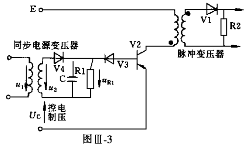 18.>、图Ⅲ-3为锯齿波同步信号的触发电路,试问:锯齿波是怎样形成的?此电路如何进行移相控制?