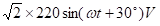 首先,我们知道正弦电压的表达式是u(t) = Umax * sin(ωt + φ),其中Umax表示电压的最大值,ω表示角频率,φ表示相位角。在这道题中,我们已知220V的正弦电压,当t=0时其瞬时值为220V,所以Umax=220V。