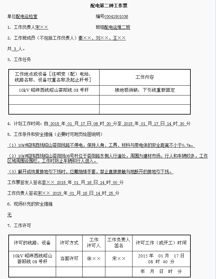 (5)工作班成员:秦××、刘××、王××(配电运维二班班员)。