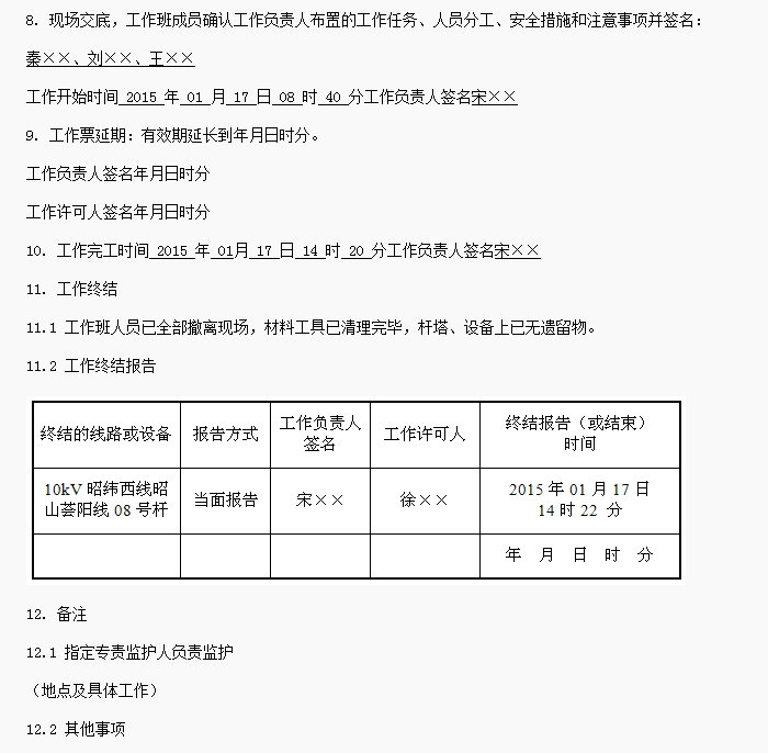 3)本工作票中安全措施的执行界面、执行主体不存在错误,“开关”“刀闸”“拉开”“合上”等操作术语不作为考点,工作单位、工作票编号、线路名称、设备名称及编号不作为考点。工作票中的安全措施,只要工作票中某一处体现即可,不局限于具体的栏目。