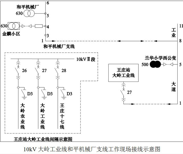 (1)工作任务:10kV大岭工业线和平机械厂支线04号杆安装开关,T接金麟房产下户线。