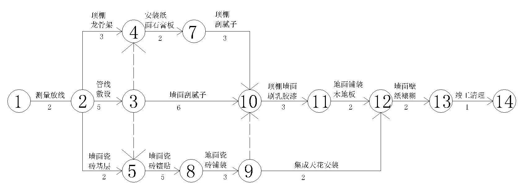 124.按照本设计方案施工的共有 4 户,由一家装饰公司承担施工任务,项目部在组 织等节拍等步距流水施工时,将每一户划分为一个施工段,按照施工内容划分为顶棚工 程、墙柱面工程、地面工程、固定家具与木门安装、壁纸与软包裱糊五个施工过程。流 水节拍 i=5 天,其双代号网络图为()