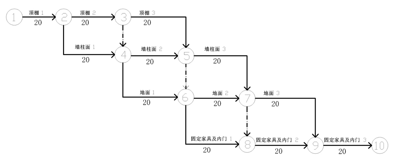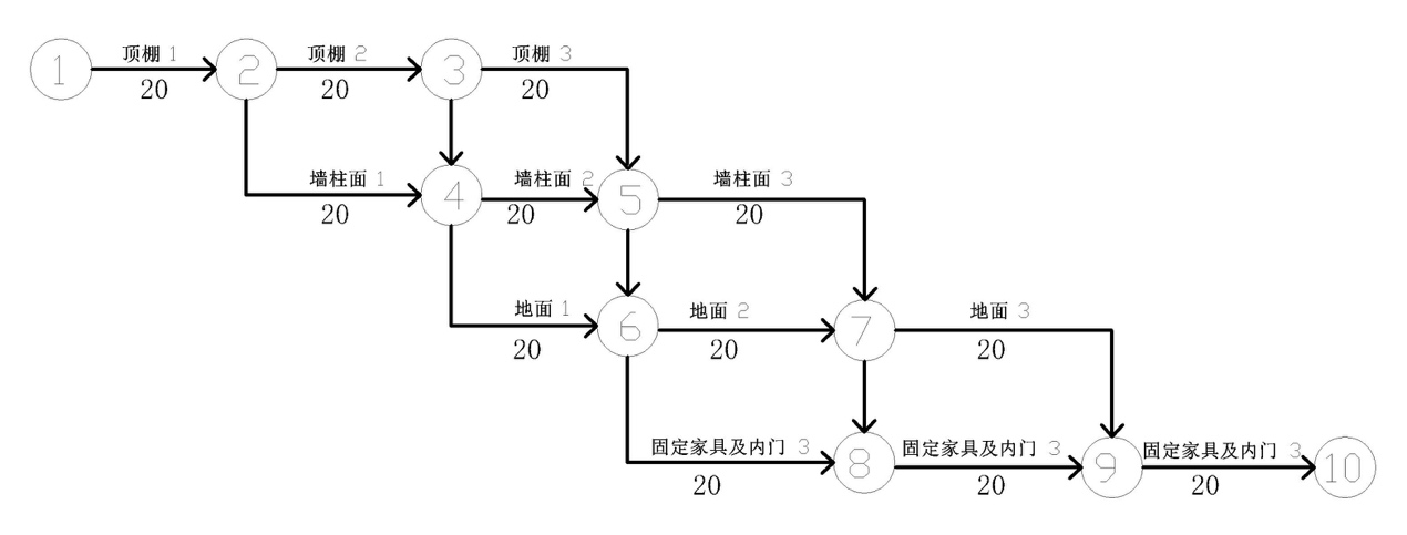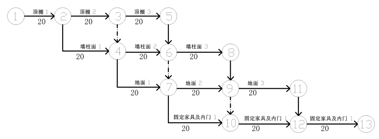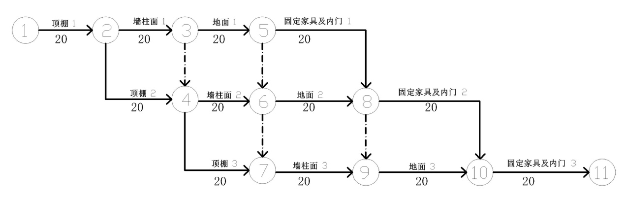 42.某样板间所在楼盘是全装修交房,3 号楼共 3 个单元,整栋楼的户型及装修方 案和本样板间完全一样, 陕西某装饰公司承担装修施工任务。该公司项目部在组织等 节拍等步距流水施工时,将每一单元划分为一个施工段,按照施工内容划分为顶棚、墙 柱面、地面、固定家具及室内门安装四个施工过程。每一个施工过程持续时间为 20 天, 下列用双代号网络图表示的进度计划中,正确的是( )。