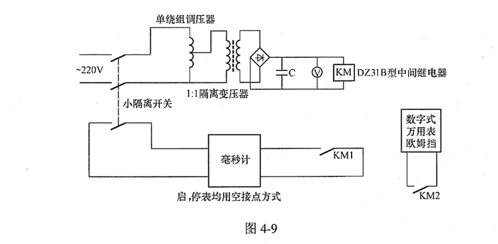 31.若用如图4—9接线进行中间继电器的动作电压、返回电压、动作时间及返回时间试验,是否可行?存在什么问题?应如何改进?