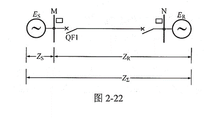 43.图2.22的双侧电源系统中,阻抗继电器装在M侧,设︳Es︳=︳ER︱=E,保护背后电源阻抗为ZR,保护正方向的等值阻抗ZR,两侧电动势间的总阻抗为Z∑。各元件的阻抗角相同。