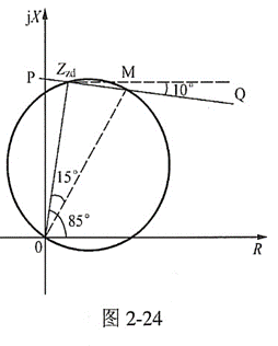 44.如需构成如图2—24所示特性的相间阻抗继电器,直线PQ下方与圆所围的部分是动作区。ZZd是整定值,OM是直径。请写出动作方程,并说明其实现方法(要求写出圆特性和直线特性的以阻抗形式表达的动作方程,写出加于继电器的电压UJ电流IJ和Zzd表达的电压动作方程以及逻辑关系)。