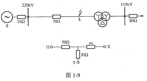 85.直馈输电线路,其零序网络与变压器的等值零序阻抗如图1—9(阻抗均换算至220kV电压),变压器220kV侧中性点接地,1lOkV侧不接地,k点的综合零序阻抗为( )