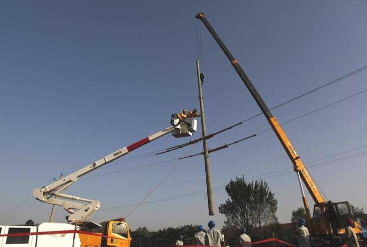 779、某带电班在 10kV 飞行线组立电杆,该班组所制定的立杆方法是使用吊车吊起电杆,从导线上方向下立杆。根据如图所示,分析此作业存在的错误。如图所示,(( ))未进行必要绝缘遮蔽。