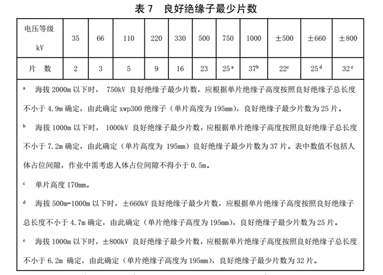 787.等电位作业人员沿绝缘子串进入强电场的作业,扣除人体短接的和零值的绝缘子片数后,良好绝缘子片数不准小于表7的规定。