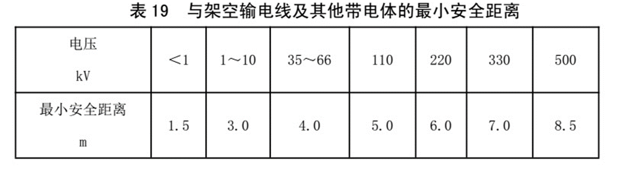 692.在带电设备附近进行立撤杆工作,杆塔、拉线与临时拉线应与带电设备保持表19所列安全距离,且有防止立、撤杆过程中拉线跳动和杆塔倾斜接近带电导线的措施。