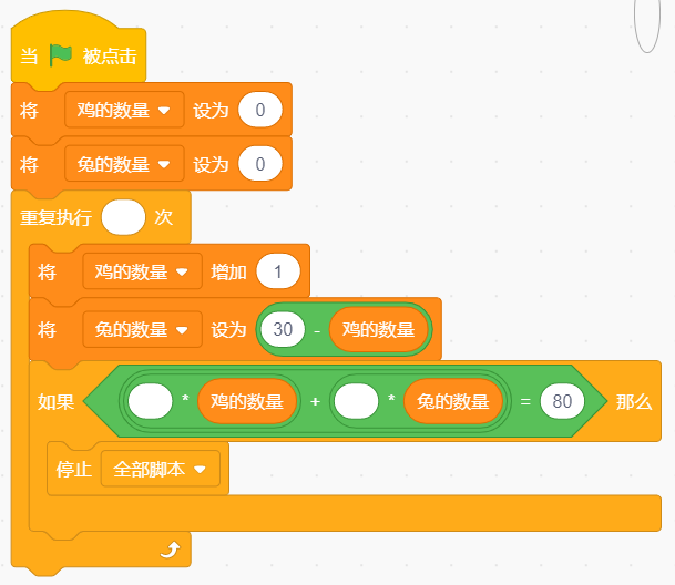 鸡和兔一共有30只,共有80条腿,如果想用下面的程序求出鸡、兔各有几只,那么程序中空白的部分应该分别填入?()