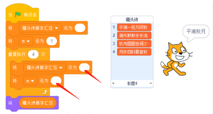 ”藏头诗”是指将所说之事分藏于诗句之首,将全诗每句中的头一个字组合起来可以传达作者的某种特有的思想,是杂体诗中的一种。如明朝大学问家徐渭(字文长)游西湖时,面对平湖秋月胜景,即席写下了七绝一首:平湖一色万顷秋,湖光渺渺水长流。秋月圆圆世间少,月好四时最宜秋。执行下面程序,若要实现选择每句诗的首字组成”平湖秋月”一词,那么程序中箭头所指的空白处应该填写?()