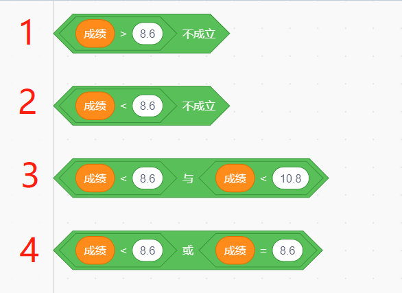 小学五年级短跑测评,男生能在10.8秒跑完50米即为及格,8.6秒跑完50米为优秀。下列哪组积木可以判断成绩为优秀?()