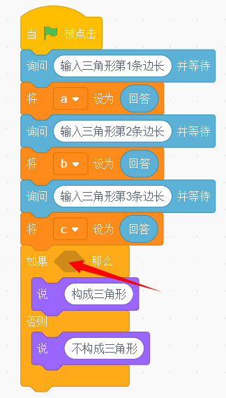 输入任意三个正整数,如果任意两个数的和大于第三个数,那么这三个数作为边长就可以构成一个三角形。想要实现自动判断能否构成三角形,程序中箭头所指的空白处应该填写?()