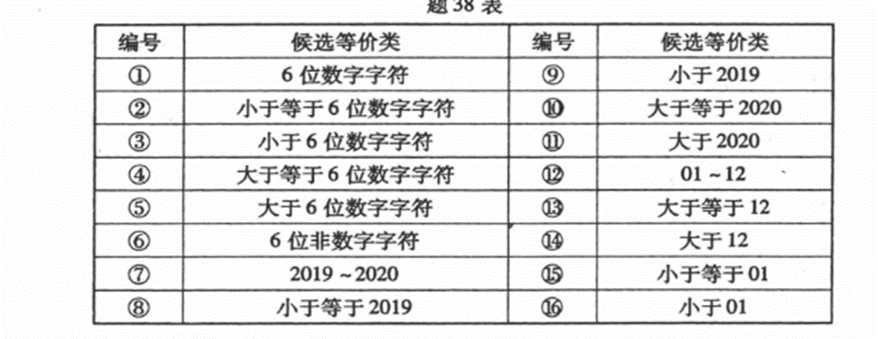 229、某报表处理系统要求用户输人处理报表的日期,系统日期规定由年、月的6位数字字符组成,前四位表示年,后两位表示月。日期限制在2019年1月至2020年12月,即系统只能对该段期间内的报表进行处理,如日期不在此范围内,则显示输入错误信息。候选的等价类见题38表。要求:(1)根据等价类方法,请从题38表中选择出有效等价类和无效等价类(选编号);(2)分别为(1)所选的等价类设计测试用例;