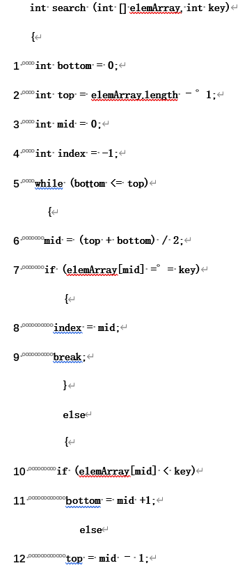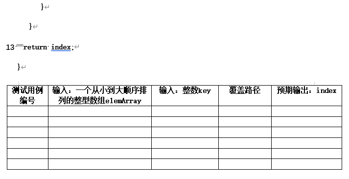 175、6、设有如下程序代码,其基本功能是:输入一个从小到大顺序排列的整型数组elemArray和一个整数key,通过二分搜索法查找key是否在elemArray中出现。若找到,则用index记录key在elemArray中的位置;若没找到,则为index赋值-1,程序将index作为返回值。试用基本路径测试法为该程序设计测试用例,填入下表。(程序中的语句已用数字进行标号)