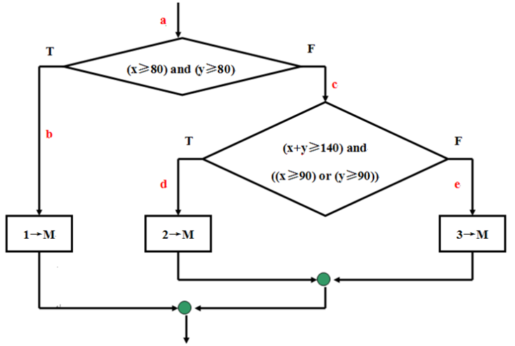 174、5、如图所示的程序有三条不同的路径。分别表示为L1(a→b)、L2(a→c→d)、L3(a→c→e)。请从供选择的答案中分别找出满足判定覆盖、条件覆盖、判定–条件覆盖标准的最小测试用例组。(用①~⑥回答)