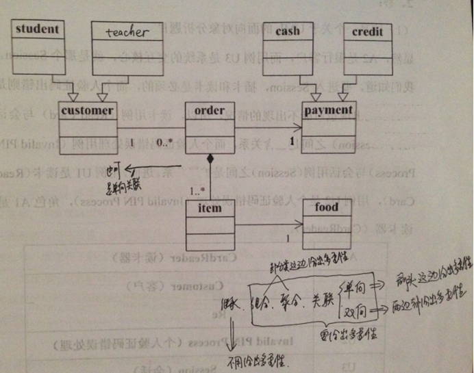126、9、某校食堂准备开发一个校园网上订餐系统,专供在校学生(student)和教职工(teacher)进行网上订餐。顾客(customer)每次订餐时,系统都会为其生成一张订单(order)。顾客在一次订餐中可以购买多种食物(food),一个订单可包含多个订单行(item),一个订单行用来记录顾客所购买的一种食物的信息(比如,食物名称、订购数量、单价、口味上的特殊要求等)。顾客为订单付款时,可以选择现金(cash)或信用卡(credit)两种付款方式(payment)。根据以上描述,补充类图:(1)识别以下实体类之间可能存在的关系:泛化、聚合、组合、关联;(2)对于聚合、组合以及关联关系请给出多重性;(3)要求使用UML符号表示。
