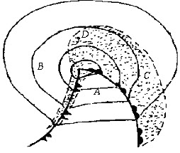 9、单选 图为北半球典型锋面气旋示意图,请问图中C点的风向为()。