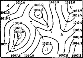 180、单选 图中给出了地面气压场分布,低压槽线为()。