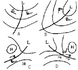 3、单选 如图是北半球槽线和切变线的气流分布,其中气流分布错误的为()。